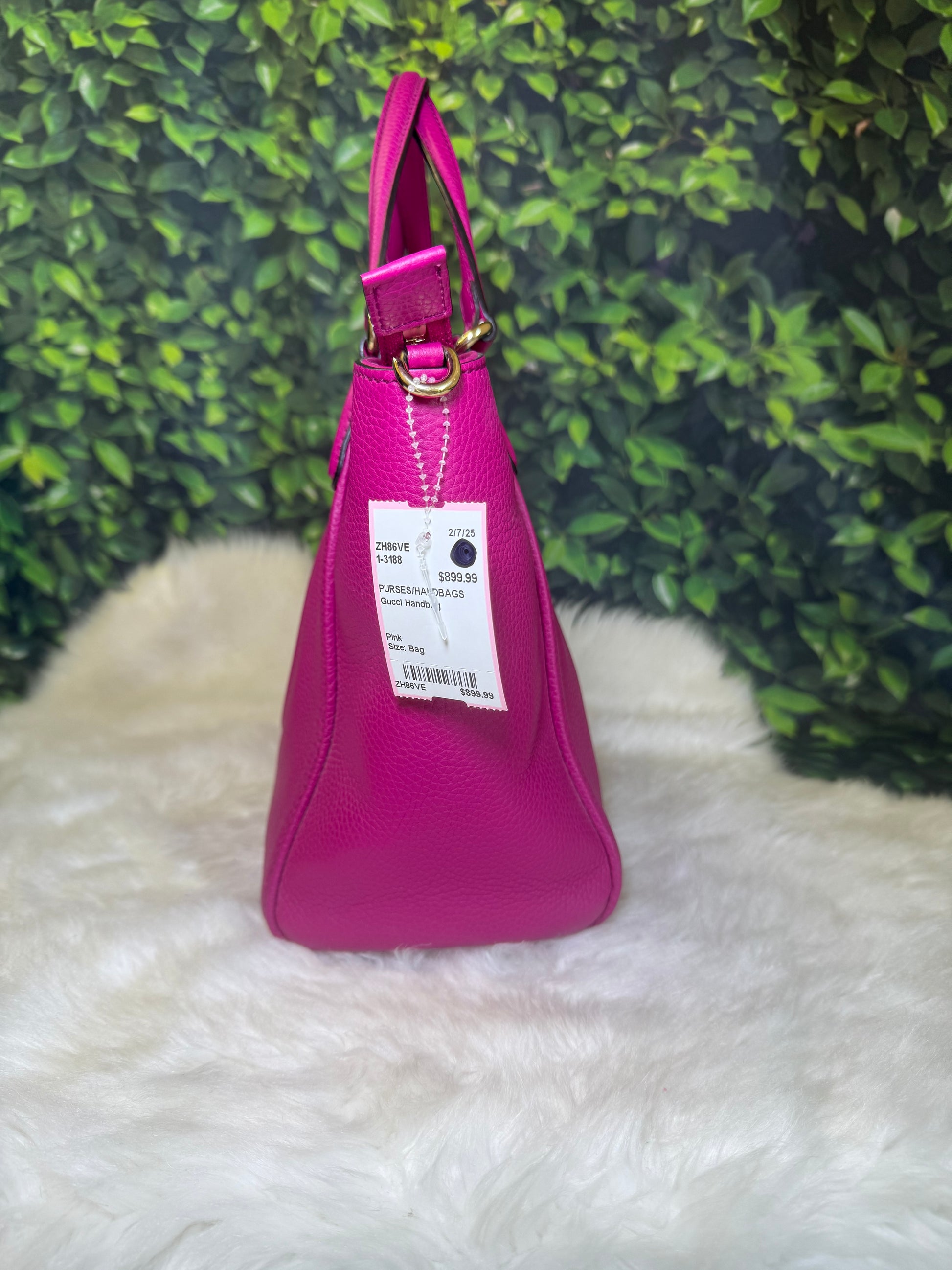 This Gucci handbag is a stunning statement piece in a vibrant shade of fuchsia pink. Crafted from luxurious pebbled leather, the bag features a structured yet slightly relaxed silhouette, making it both stylish and functional. The front prominently showcases Gucci’s interlocking "GG" logo embossed in the leather, adding a touch of signature elegance.